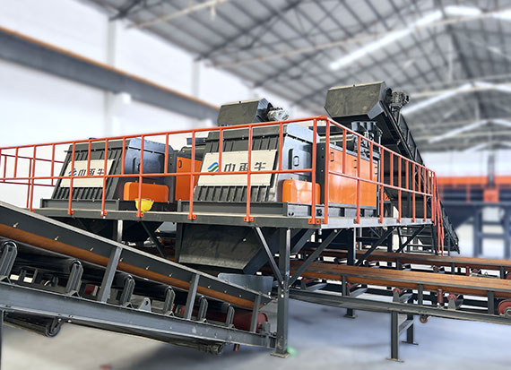 破碎線主機(jī)殼體采用特厚鋼板制造,內(nèi)襯為高錳鑄鋼件,可更換;主機(jī)轉(zhuǎn)子盤安裝于水平軸上,轉(zhuǎn)子盤圓周分布有銷軸,軸向懸有錘頭;主軸用滾珠軸承支撐,循環(huán)油強(qiáng)制潤滑冷卻,并裝有溫度傳感器;進(jìn)料口裝有液壓輥筒喂料裝置,位置一高一低,同向旋轉(zhuǎn),能將大件松散物料壓扁,送入破碎腔內(nèi)。